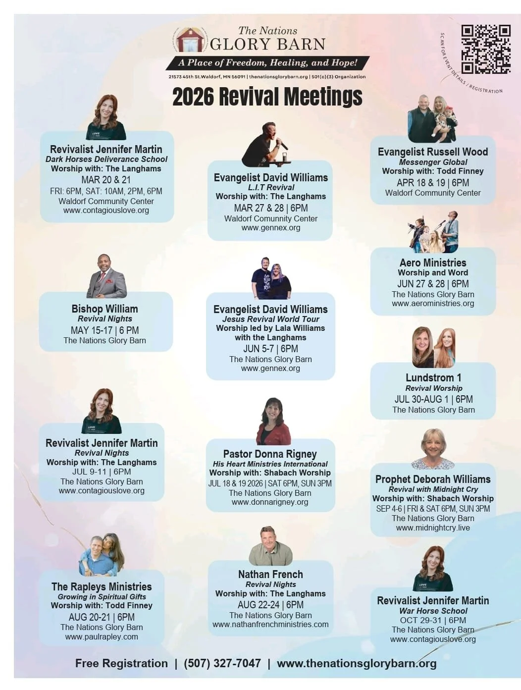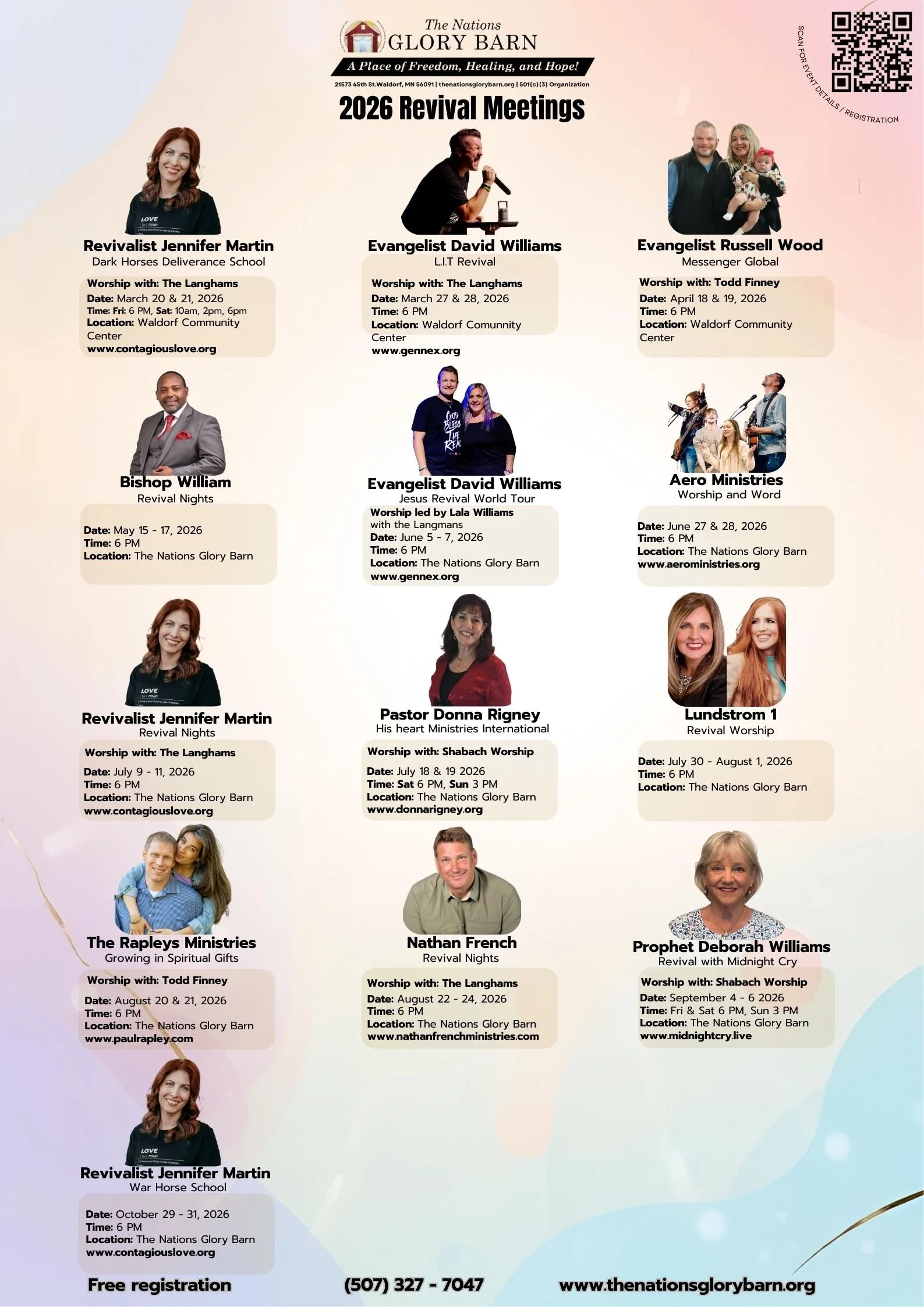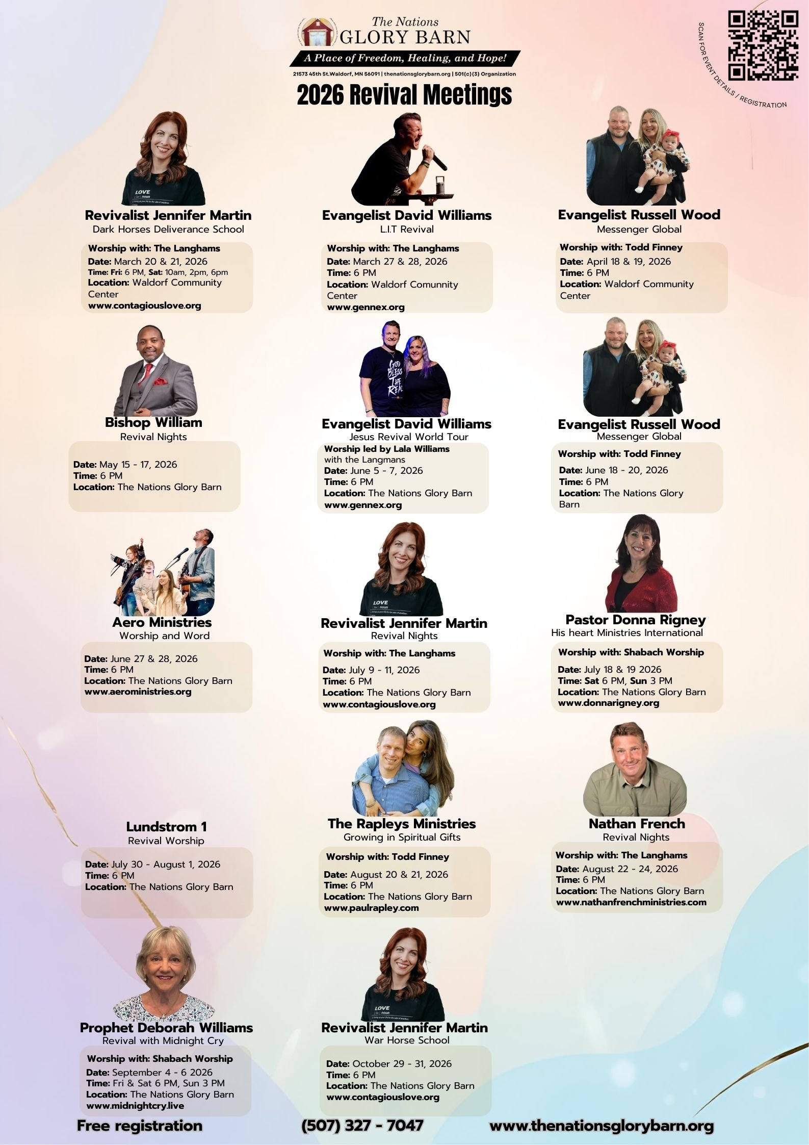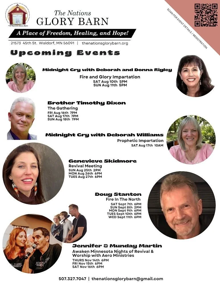 The Nations Glory Barn exists through the faithfulness and generosity of those who believe in what God is doing in this place. Your partnership helps us host revival gatherings, welcome visiting prophets, and steward this space for the work of the Lord.